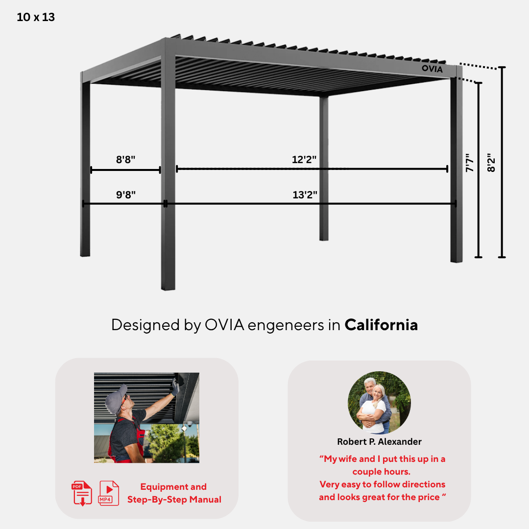 Discover the beauty and craftsmanship of an OVIA pergola with total peace of mind. With our 100-Day Risk-Free Trial, you can install, experience, and decide at your own pace.